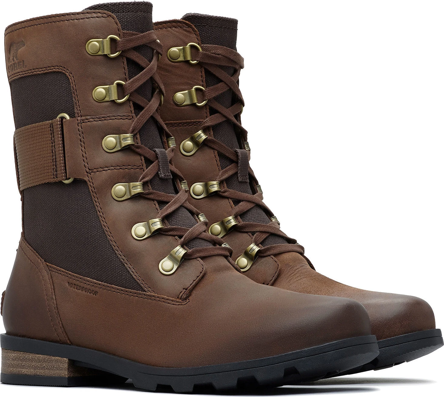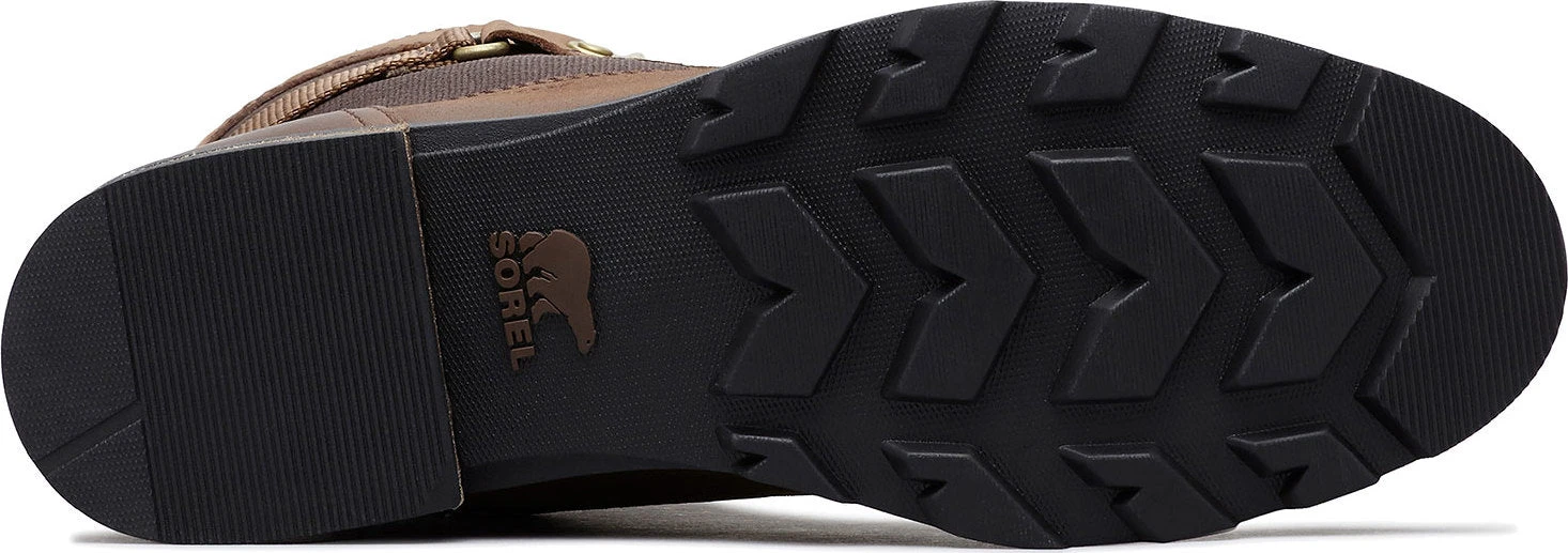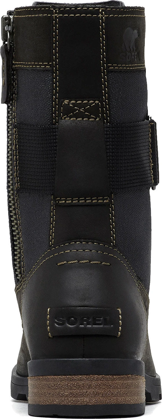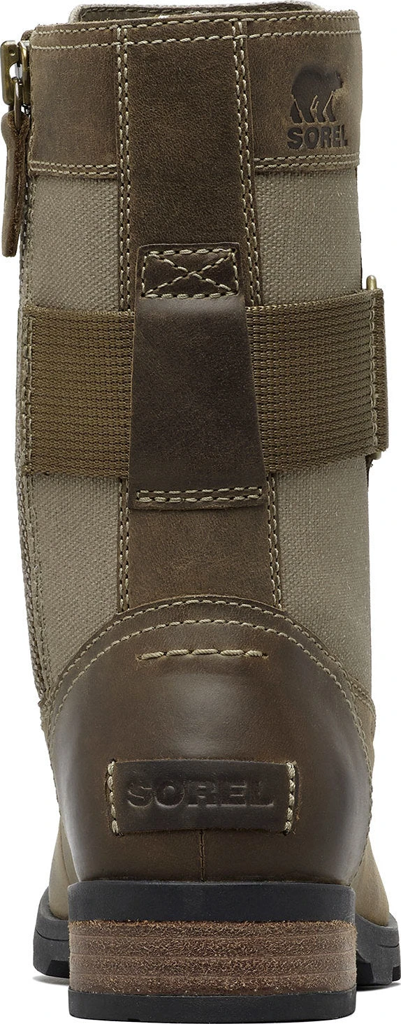 The women’s EMILIE Conquest Boot is a performing wet-weather protector that sacrifices nothing in style or edge while getting to work or play in the rain. The waterproof upper of full grain leather and coated canvas gives contrast paneling and is fully seam-sealed against water. The lining is a canvas-synthetic blend. A removable die-cut memory EVA footbed provides cushion and comfort. A microfleece top cover ups the comfort level further. A rubber midsole and molded rubber outsole give sturdiness and traction. The block heel is leather-wrapped. Brass hardware and buckle details lend an edge to the boot.