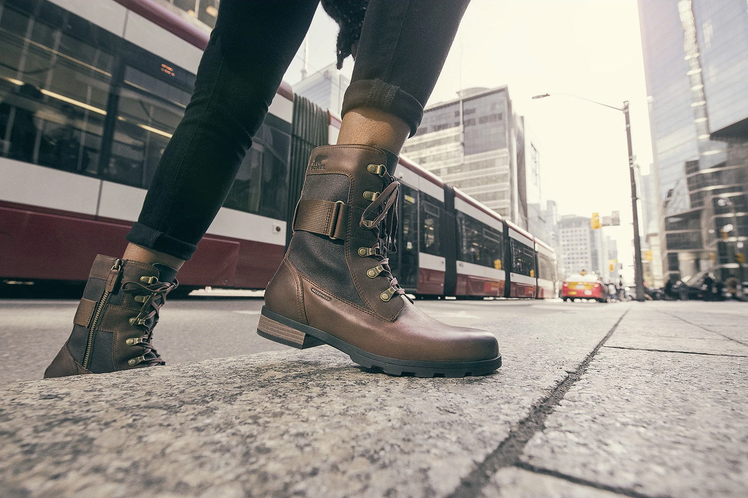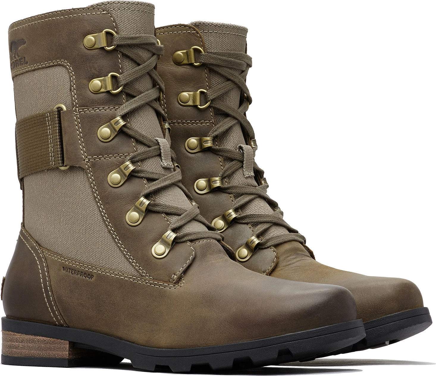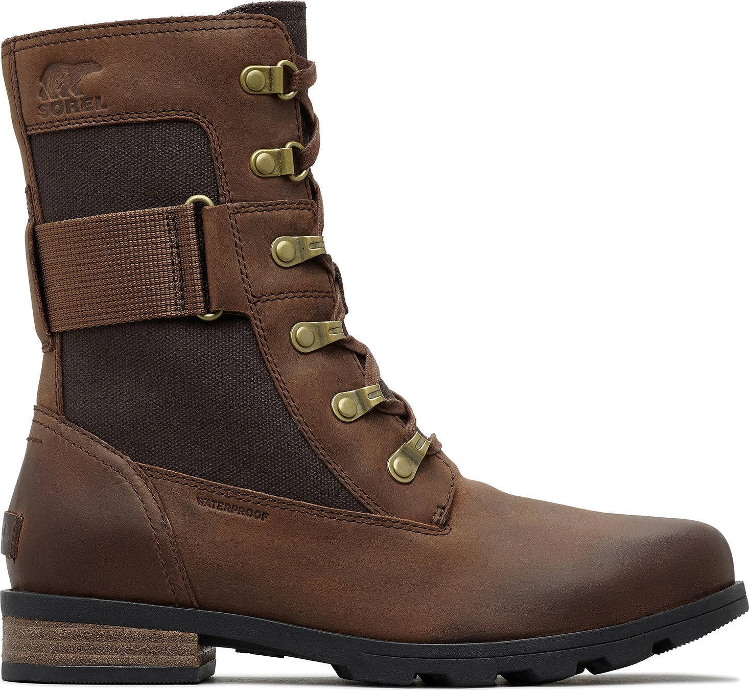 The women’s EMILIE Conquest Boot is a performing wet-weather protector that sacrifices nothing in style or edge while getting to work or play in the rain. The waterproof upper of full grain leather and coated canvas gives contrast paneling and is fully seam-sealed against water. The lining is a canvas-synthetic blend. A removable die-cut memory EVA footbed provides cushion and comfort. A microfleece top cover ups the comfort level further. A rubber midsole and molded rubber outsole give sturdiness and traction. The block heel is leather-wrapped. Brass hardware and buckle details lend an edge to the boot.