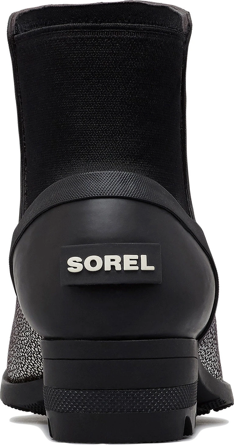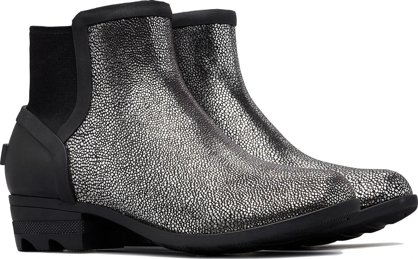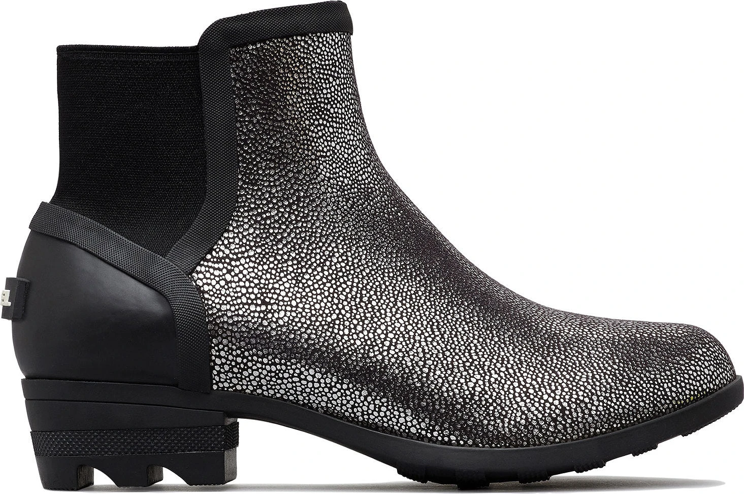 The women’s JANEY CHELSEA Boots deliver a sparkling style for seasonal outings. These boots feature a metallic rubber upper. The heel is a stretchy fabric, allowing for easy entries. The interior of the boot features an Airmesh lining. A removable perforated EVA footbed with a mesh topcover improves breathability and moisture evacuation. A vulcanized rubber midsole with a beautiful shape enhances support. The molded rubber outsole with a siping and compound improves traction on wet sidewalks.