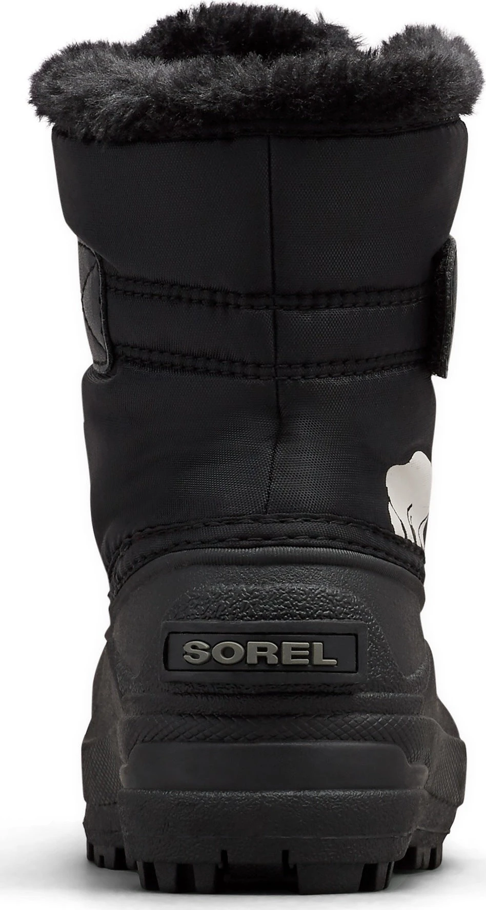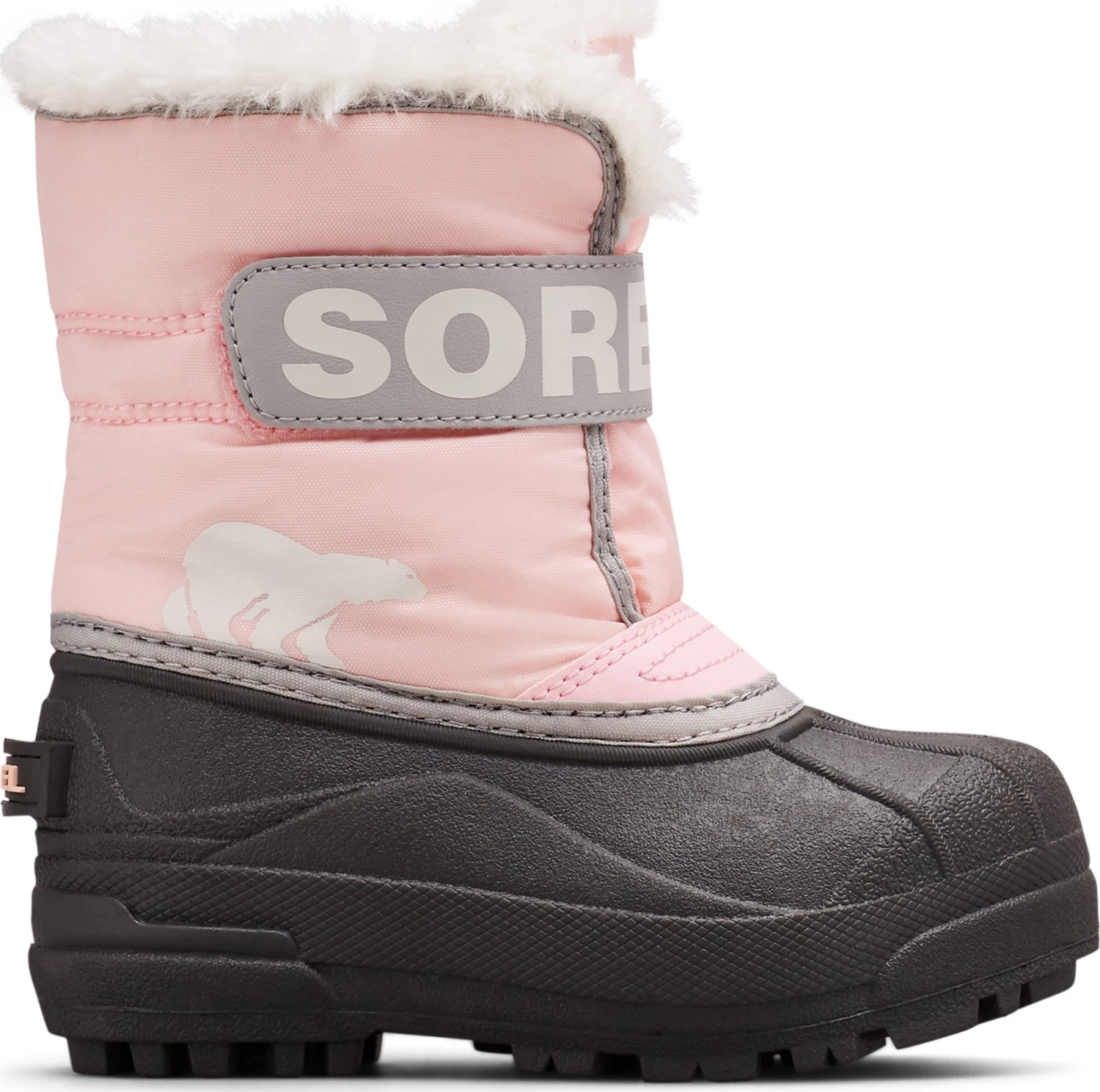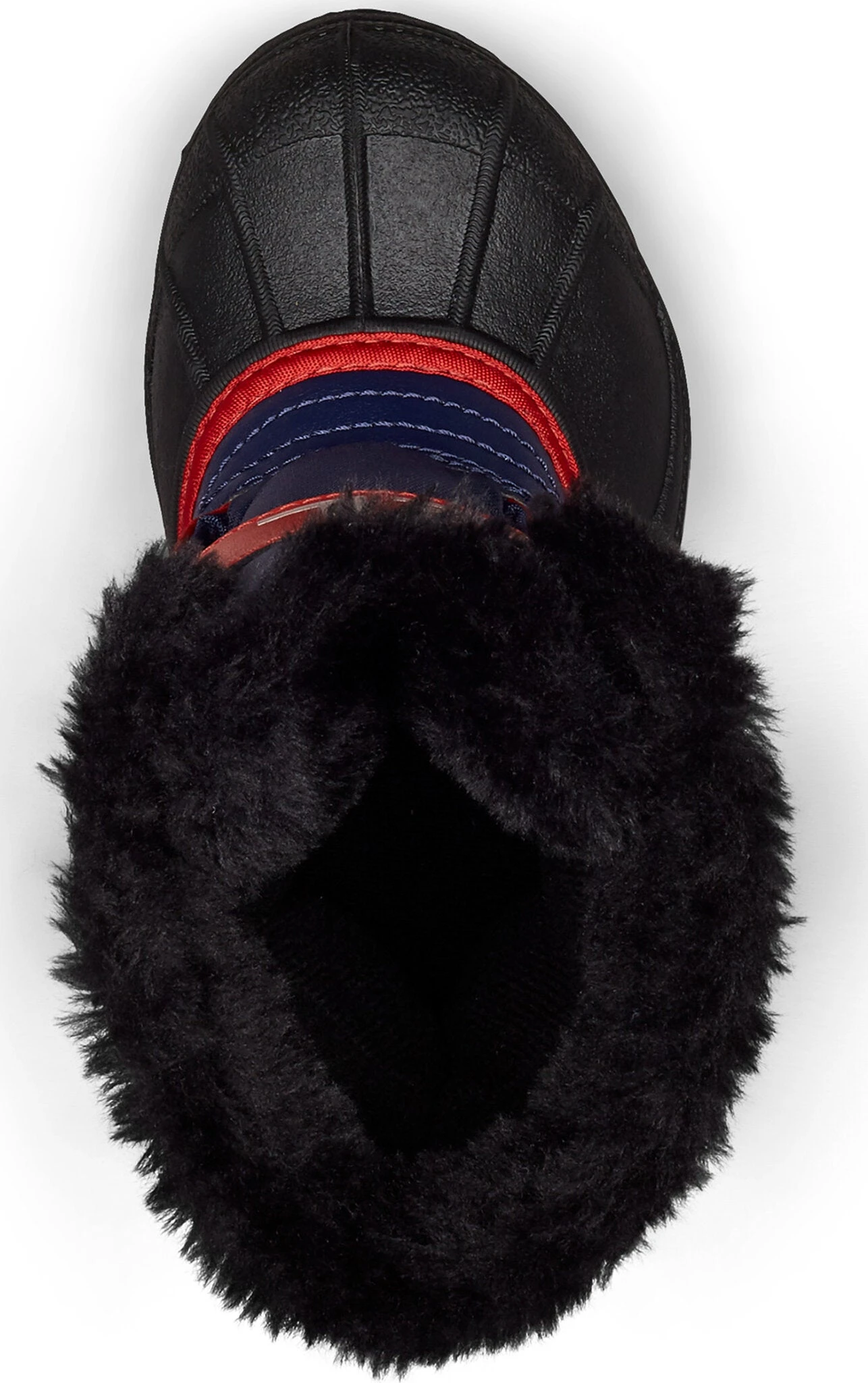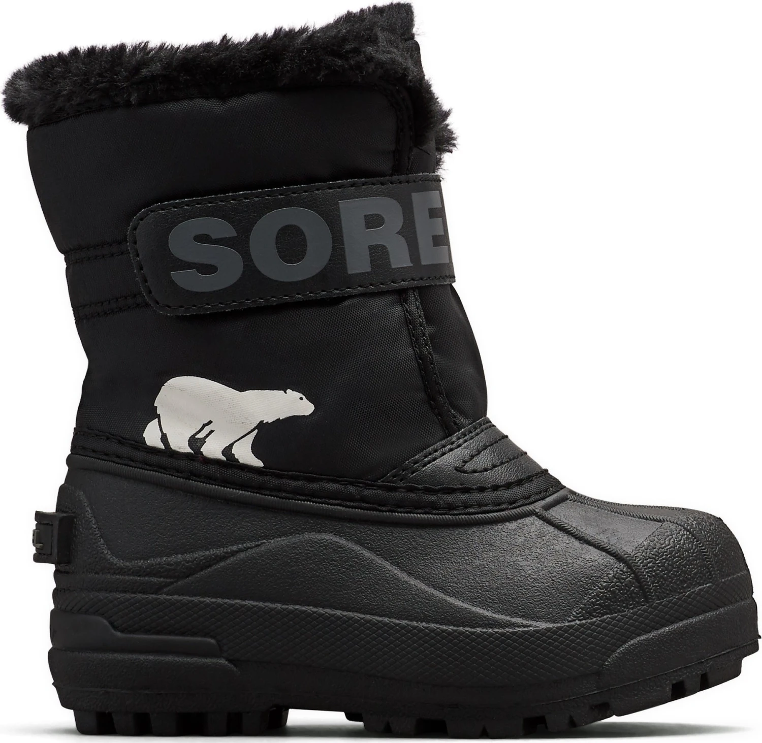 The Kids SNOW VCOMMANDER Winter Boot by Sorel is warm, waterproof, rugged and cozy. The 200 grams of insulation will trap heat and keep the cold out down to -32 degrees Celsius. PU backed synthetic textile upper is rugged. Fleece lining feels great all winter long. The waterproof thermal rubber outsole shell features multi-directional lugs – essential for all Kings and Queens of the mountain.